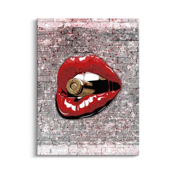 "BULLET LIPS" ist in drei hochwertigen Materialvarianten erhältlich: Leinwand mit handgefertigtem 8-Farb-Pigmentdruck und formstabilem Keilrahmen, Aluminium mit kratzfester Oberfläche und 3mm starker Aluminiumplatte, sowie Acrylglas mit 5mm extra-starkem Material und faszinierender Tiefenwirkung. Alle Varianten werden in deutscher Manufaktur in sorgfältiger Handarbeit hergestellt.