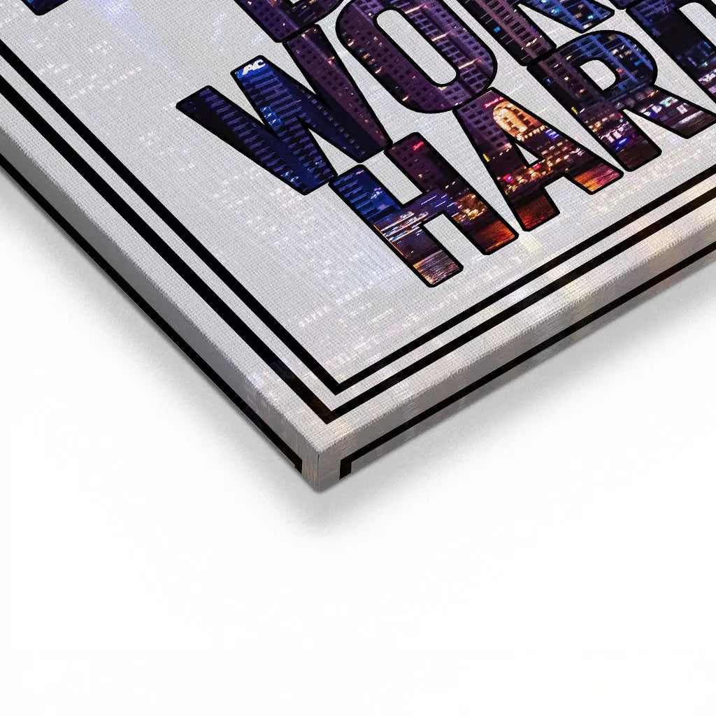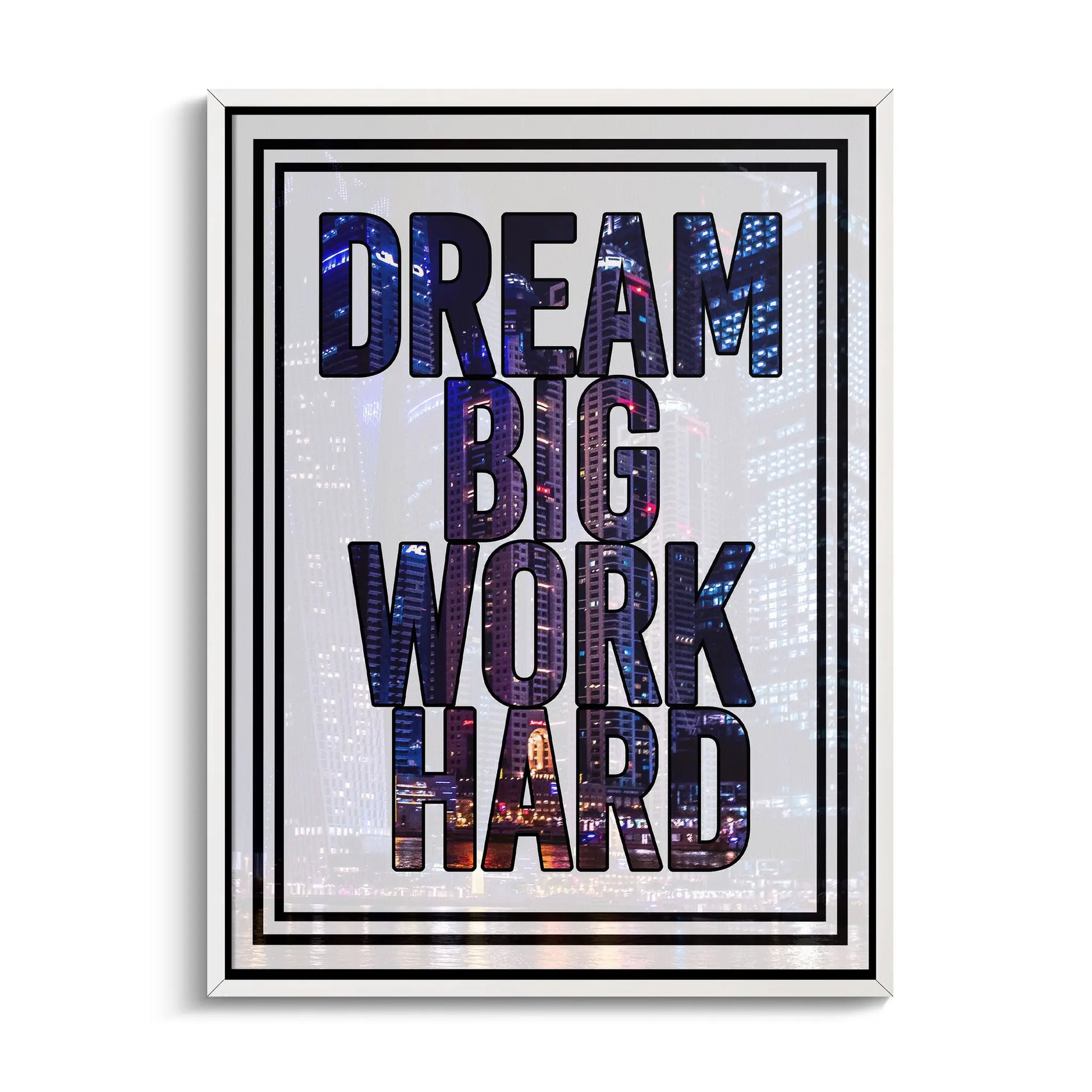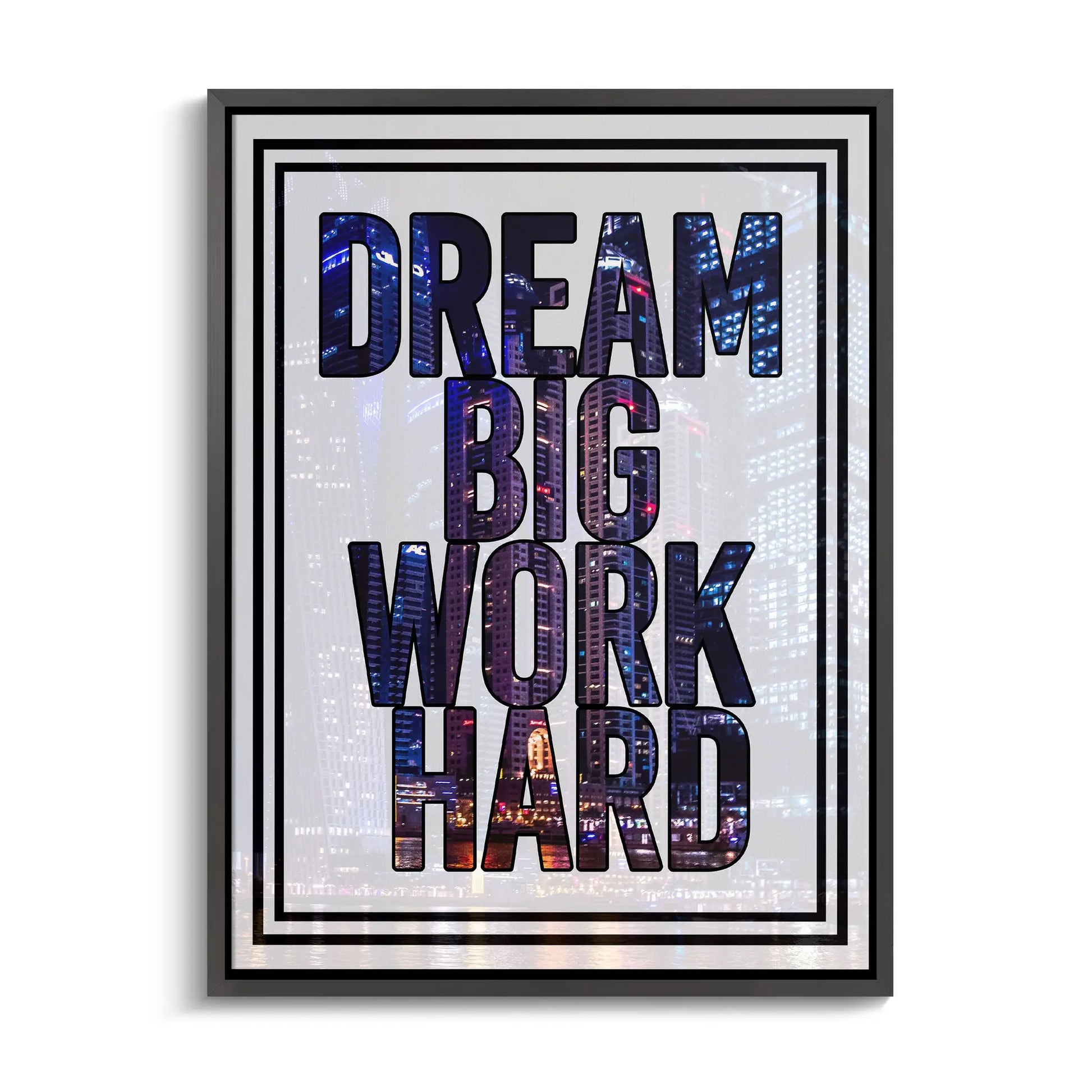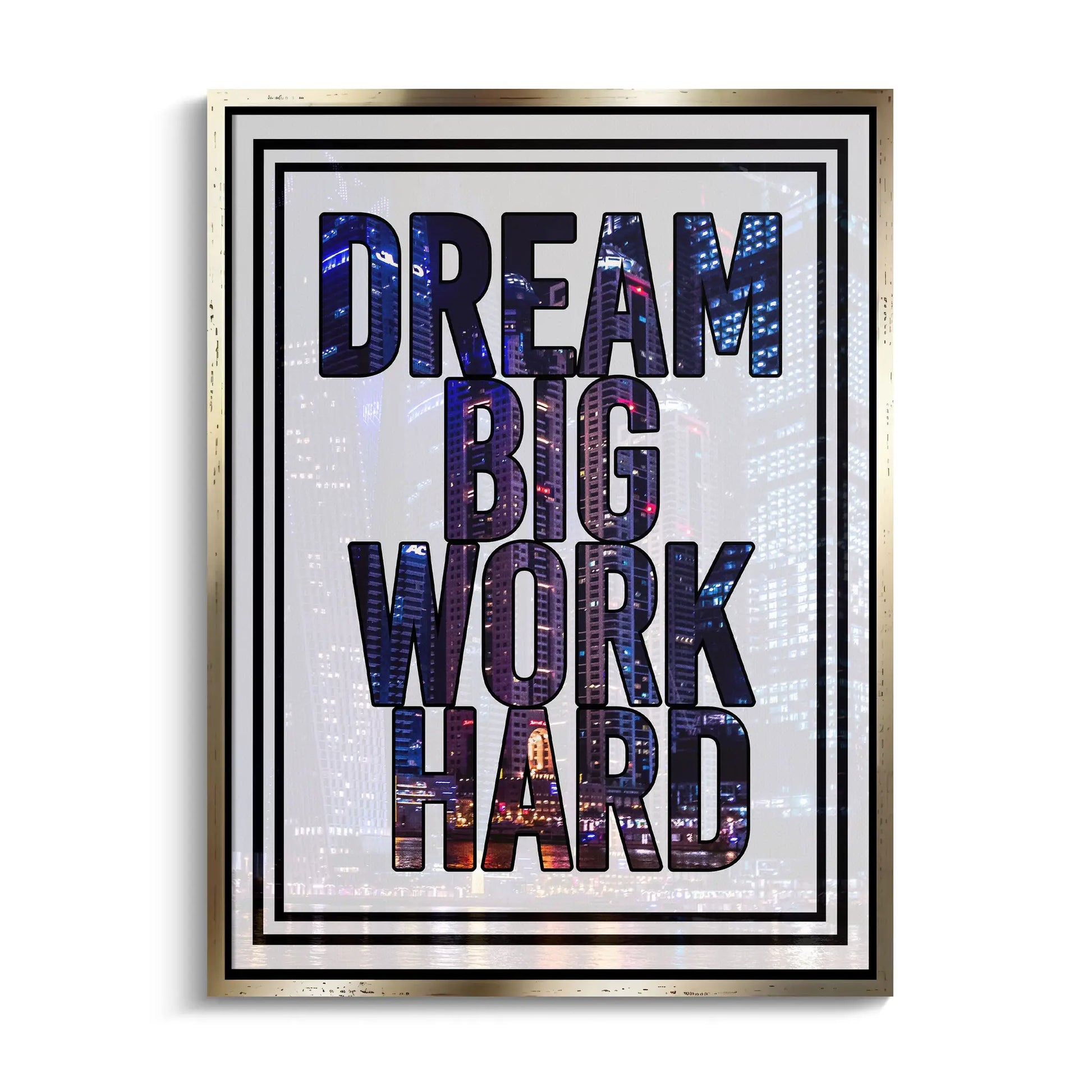 "DREAM BIG WORK HARD" ist in drei hochwertigen Materialvarianten erhältlich: Leinwand mit handgefertigtem 8-Farb-Pigmentdruck und formstabilem Keilrahmen, Aluminium mit kratzfester Oberfläche und 3mm starker Aluminiumplatte, sowie Acrylglas mit 5mm extra-starkem Material und faszinierender Tiefenwirkung. Alle Varianten werden in deutscher Manufaktur in sorgfältiger Handarbeit hergestellt.
