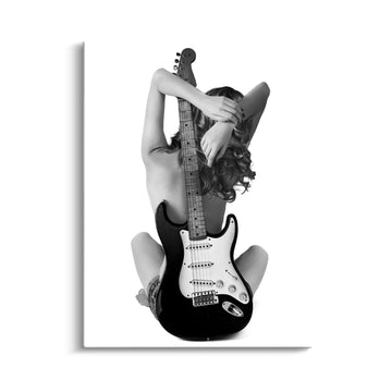 Pack dein "LADY AND THE STRAT" Wandbild vorsichtig aus der Verpackung. Bei Acrylglas-Varianten ziehe die Schutzfolie ab. Prüfe das Bild auf Transportschäden und lege alle mitgelieferten Aufhänge-Komponenten bereit.
