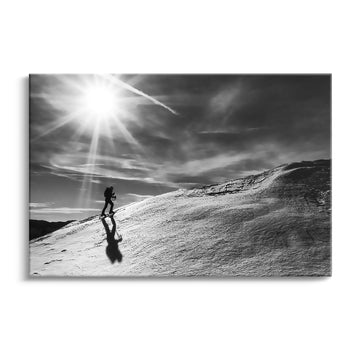 "WAY TO THE SUMMIT" ist in drei hochwertigen Materialvarianten erhältlich: Leinwand mit handgefertigtem 8-Farb-Pigmentdruck und formstabilem Keilrahmen, Aluminium mit kratzfester Oberfläche und 3mm starker Aluminiumplatte, sowie Acrylglas mit 5mm extra-starkem Material und faszinierender Tiefenwirkung. Alle Varianten werden in deutscher Manufaktur in sorgfältiger Handarbeit hergestellt.