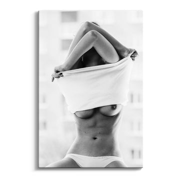 Pack dein "HOT SIMONA" Wandbild vorsichtig aus der Verpackung. Bei Acrylglas-Varianten ziehe die Schutzfolie ab. Prüfe das Bild auf Transportschäden und lege alle mitgelieferten Aufhänge-Komponenten bereit.