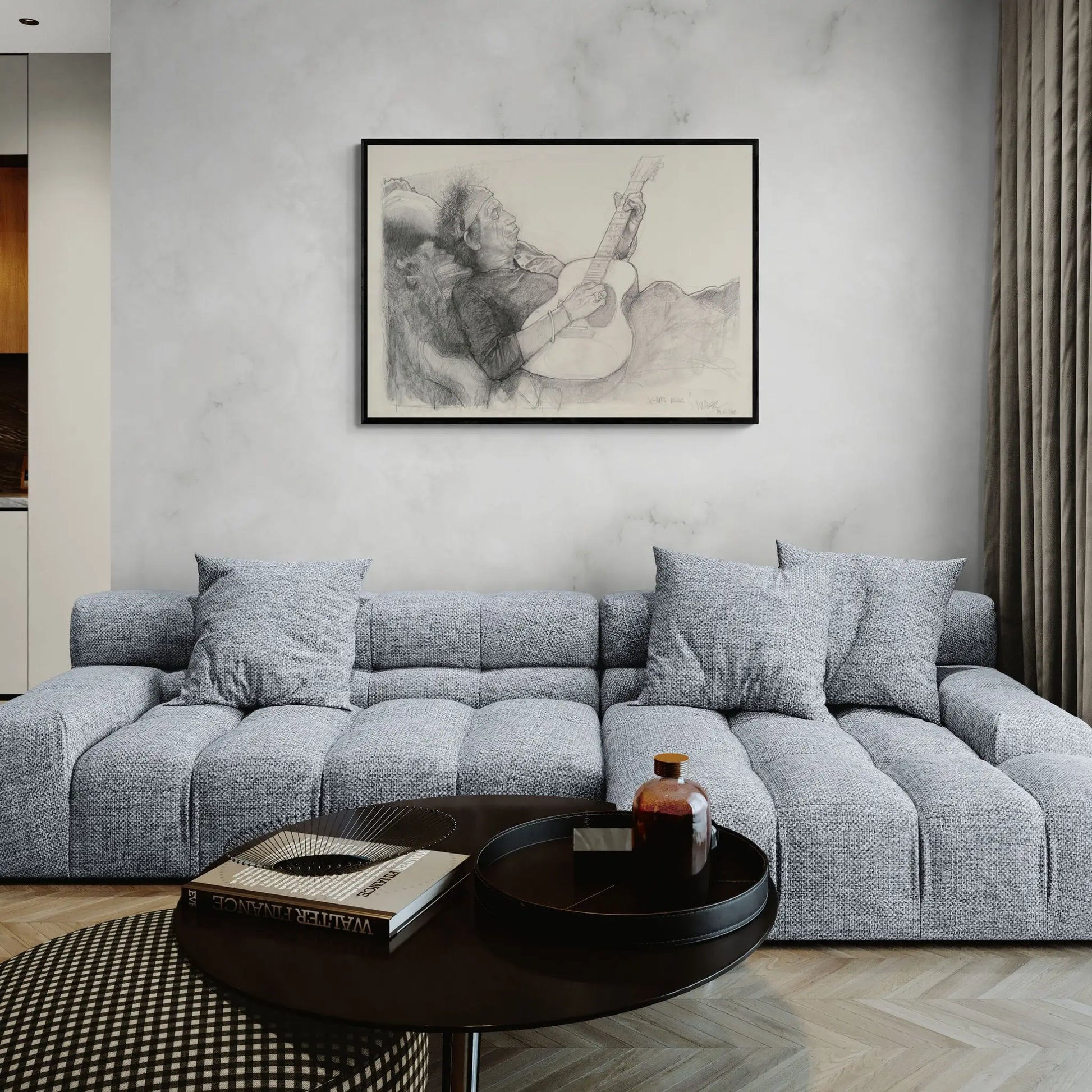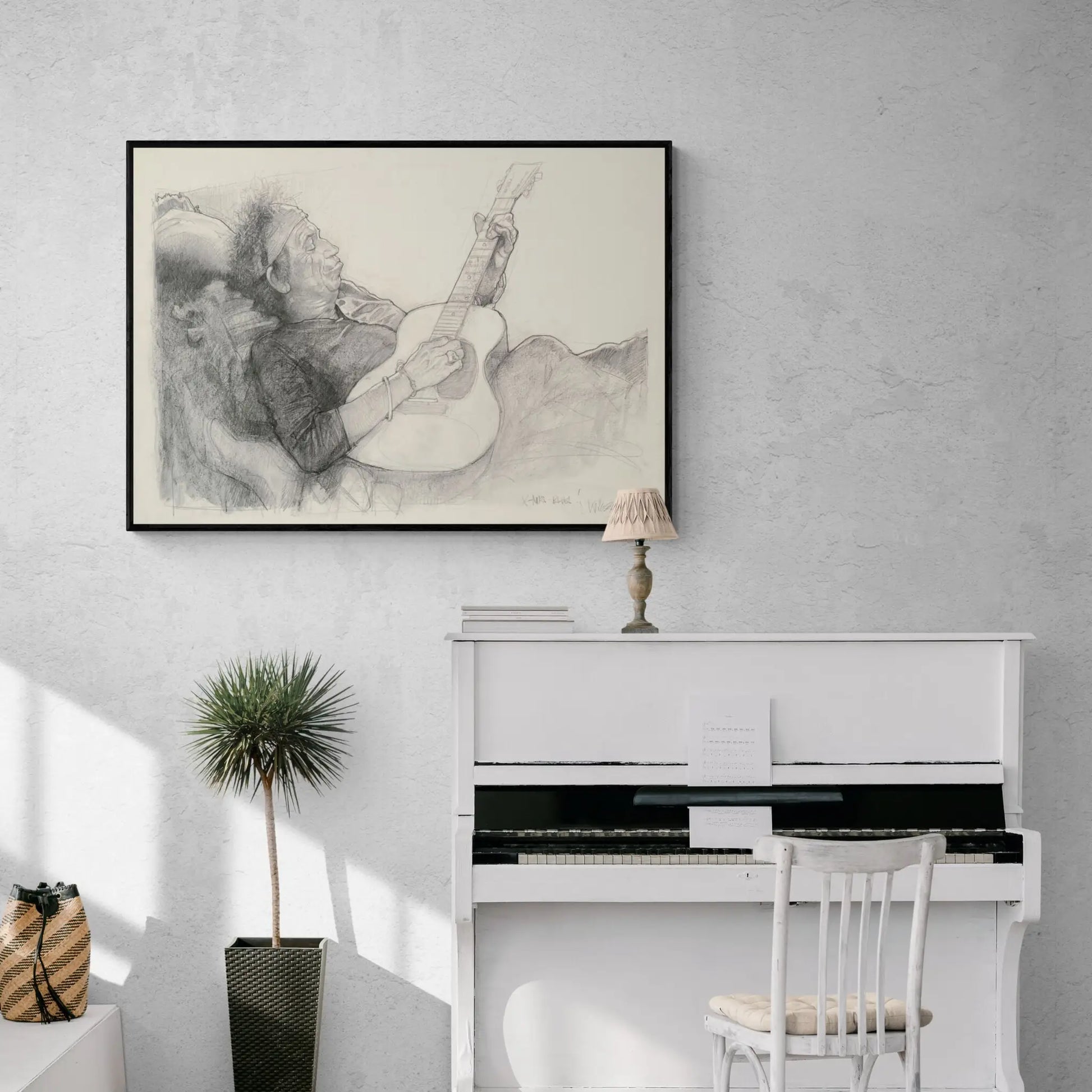 Che sia un omaggio a uno dei più grandi chitarristi di tutti i tempi o un'opera d'arte d'atmosfera, questo disegno è una dichiarazione di atemporalità, di anima musicale e di passione ininterrotta. Disponibile come riproduzione di alta qualità su tela, alluminio dibond o vetro acrilico.