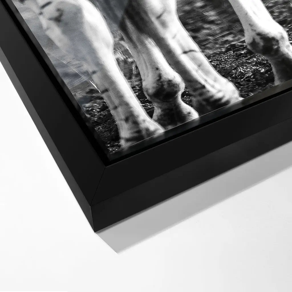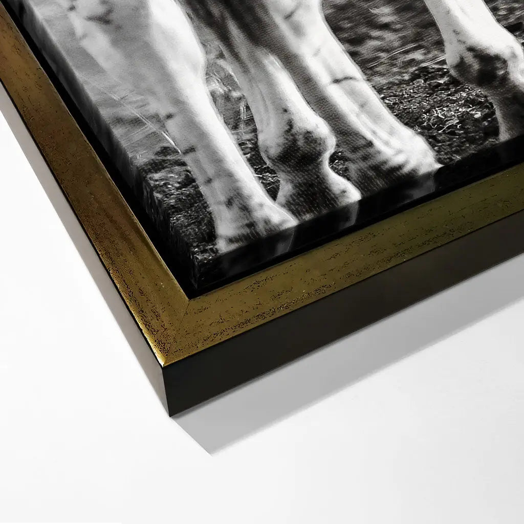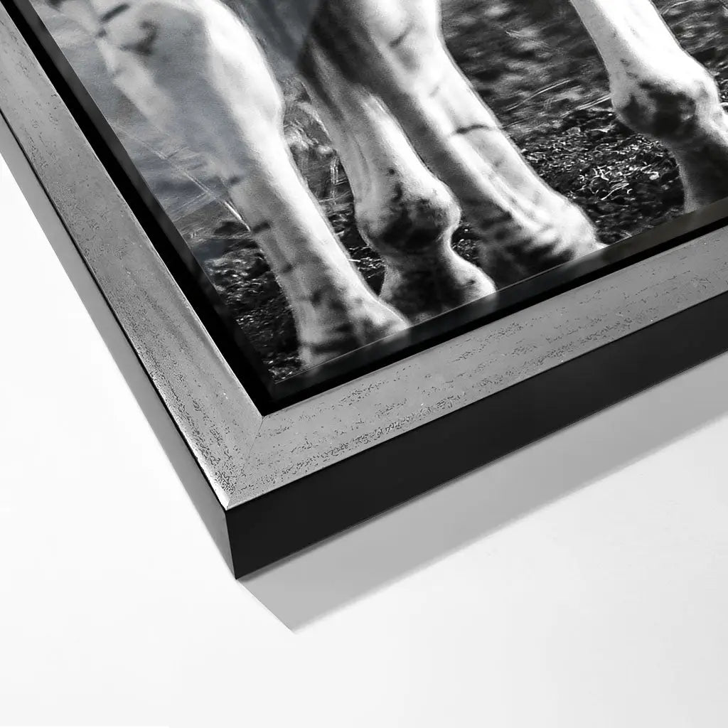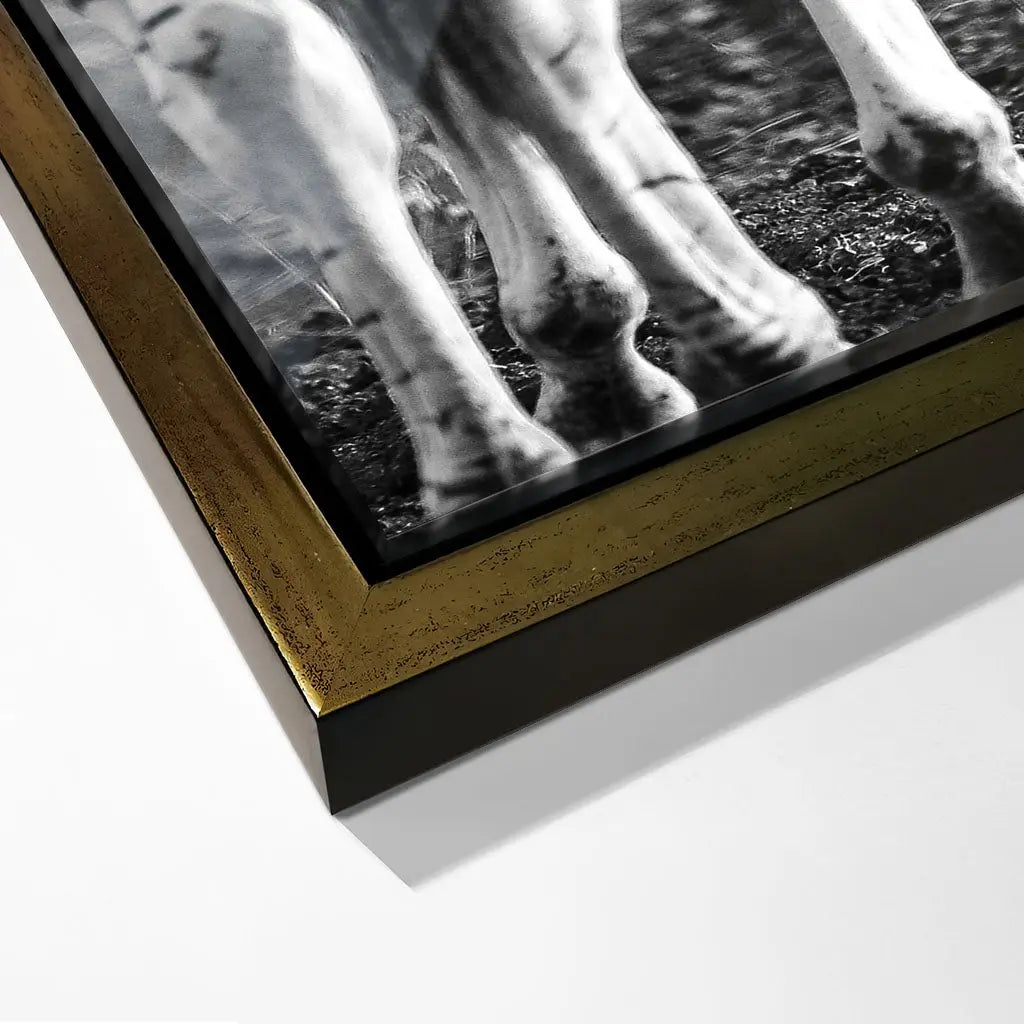 "STRIPED HORSE BACK SIDE" ist in drei hochwertigen Materialvarianten erhältlich: Leinwand mit handgefertigtem 8-Farb-Pigmentdruck und formstabilem Keilrahmen, Aluminium mit kratzfester Oberfläche und 3mm starker Aluminiumplatte, sowie Acrylglas mit 5mm extra-starkem Material und faszinierender Tiefenwirkung. Alle Varianten werden in deutscher Manufaktur in sorgfältiger Handarbeit hergestellt.