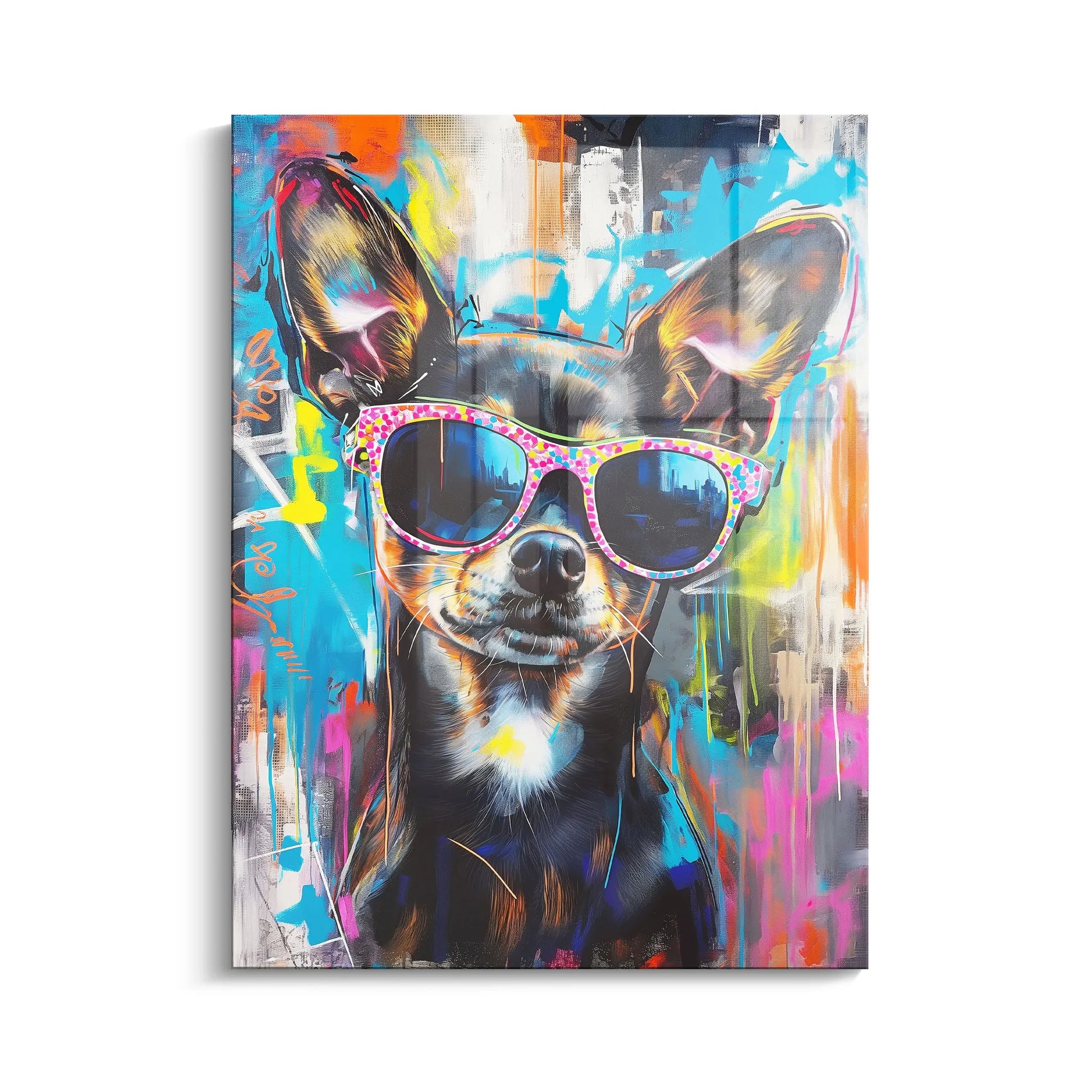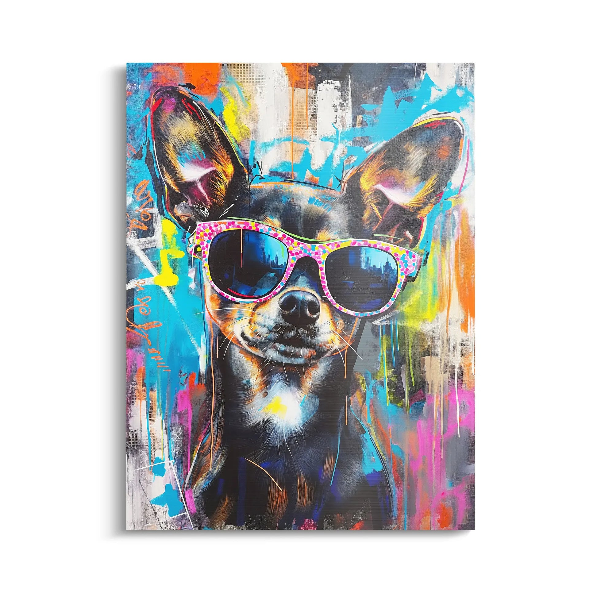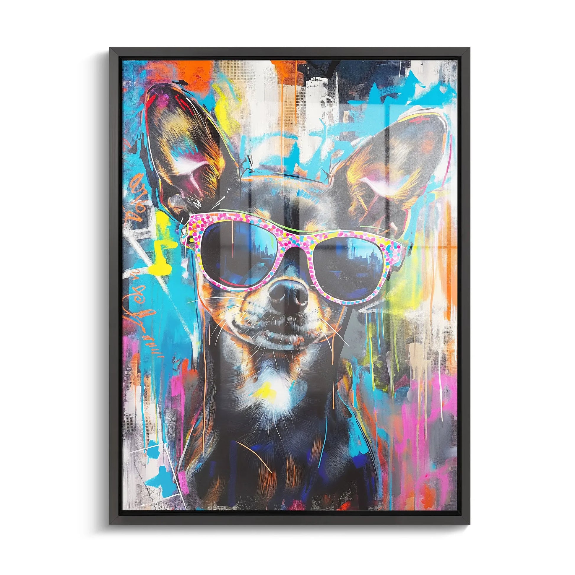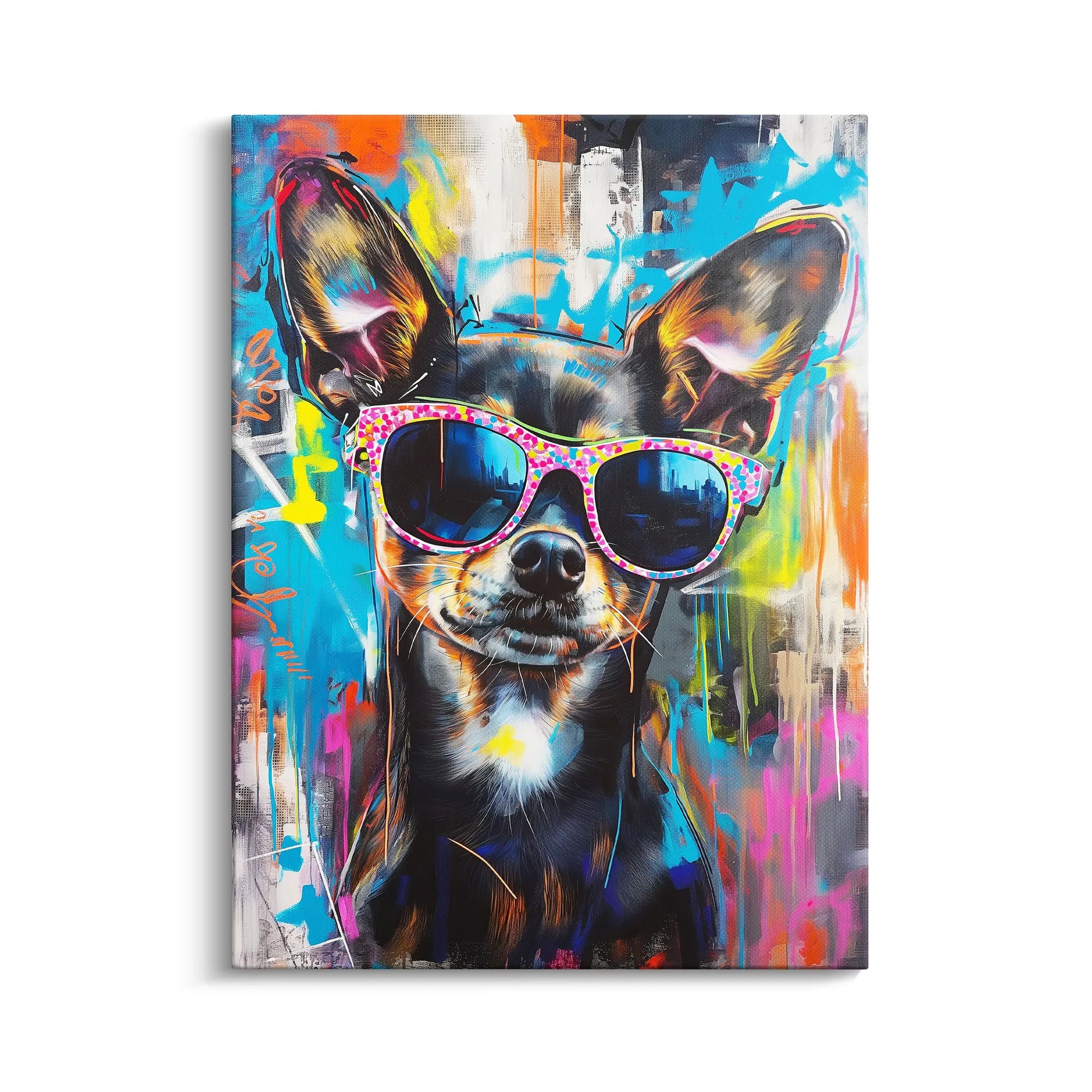 Das Wandbild "Bad Girl" von Canvarisma vereint frechen Hundecharme mit urbaner Kunstexplosion. Dieses ausdrucksstarke Kunstwerk zeigt einen selbstbewussten Chihuahua mit riesigen Stehohren und gepunkteter Sonnenbrille, der direkt in die Kamera schaut. Die Skyline-Reflexion in den Sonnengläsern verleiht dem kleinen Hund großstädtischen Coolness-Faktor. Der explosive Hintergrund aus leuchtenden Farbspritzern in Türkis, Pink, Orange, Gelb und Neongrün sowie expressiven Pinselstrichen schafft eine dynamische Street Art-Ästhetik voller Energie und Lebensfreude.