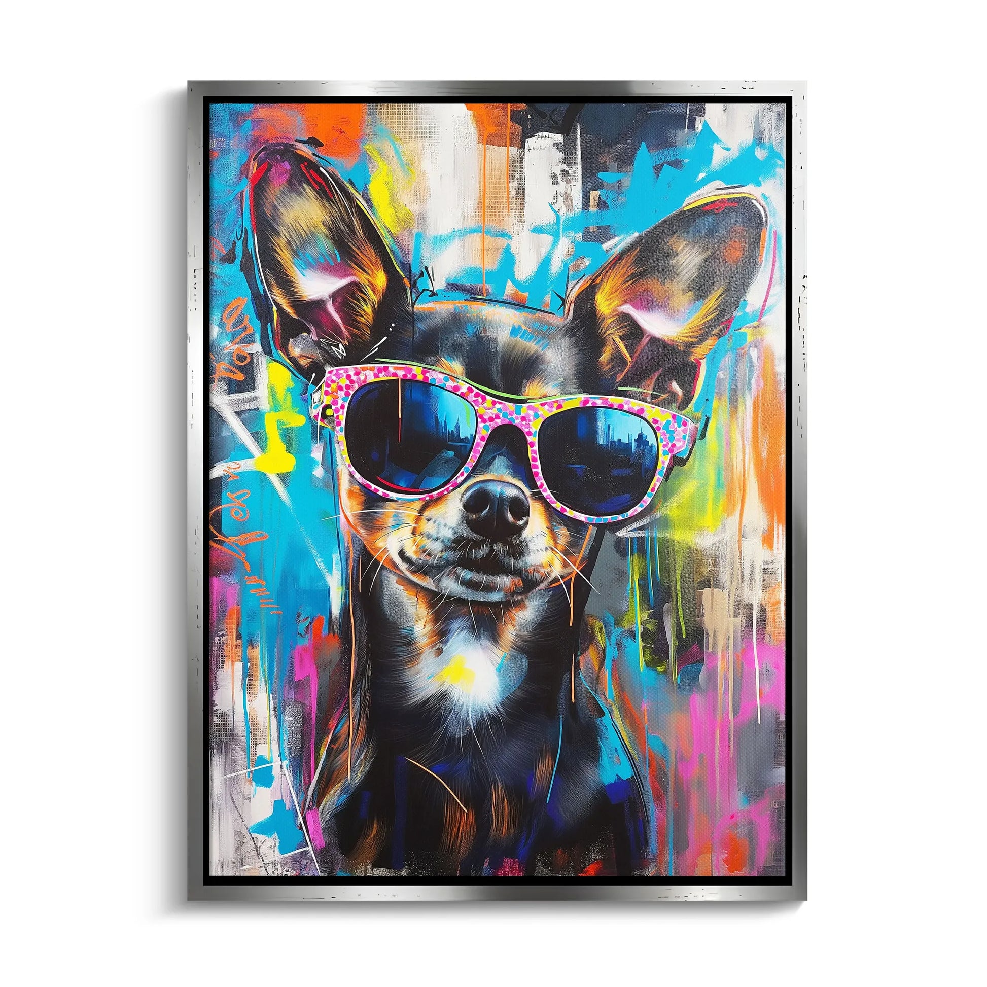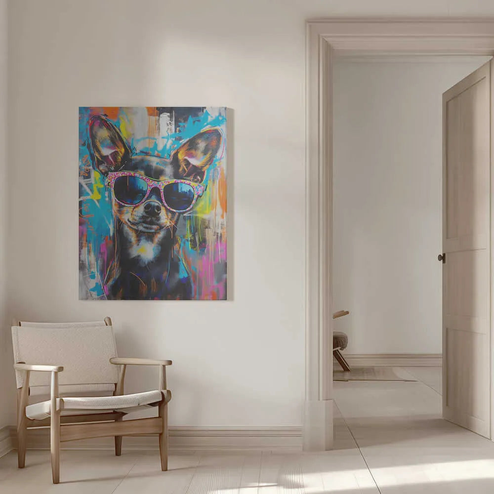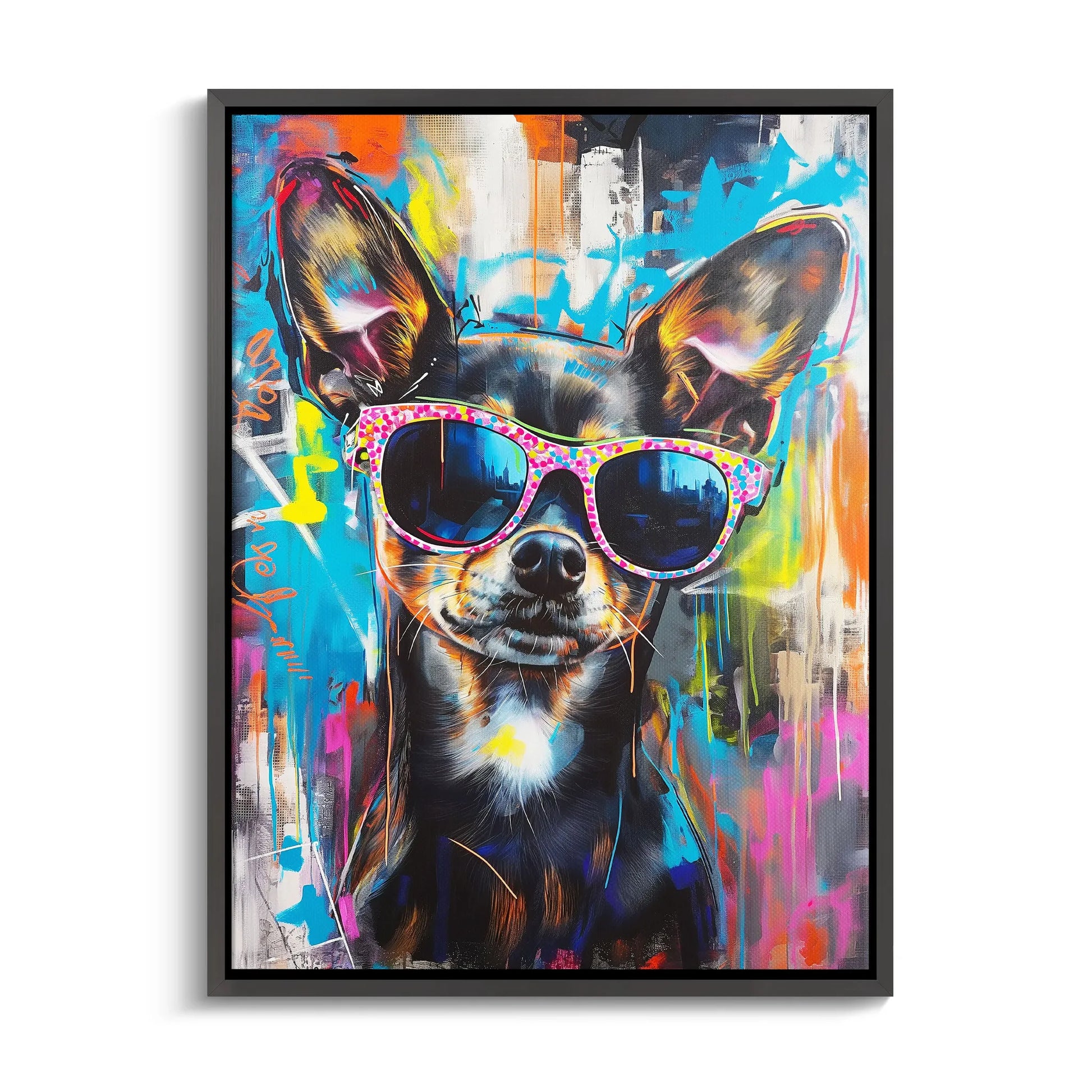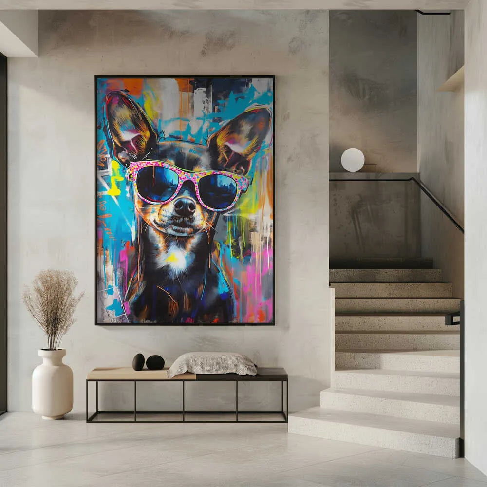 Das Wandbild "Bad Girl" von Canvarisma vereint frechen Hundecharme mit urbaner Kunstexplosion. Dieses ausdrucksstarke Kunstwerk zeigt einen selbstbewussten Chihuahua mit riesigen Stehohren und gepunkteter Sonnenbrille, der direkt in die Kamera schaut. Die Skyline-Reflexion in den Sonnengläsern verleiht dem kleinen Hund großstädtischen Coolness-Faktor. Der explosive Hintergrund aus leuchtenden Farbspritzern in Türkis, Pink, Orange, Gelb und Neongrün sowie expressiven Pinselstrichen schafft eine dynamische Street Art-Ästhetik voller Energie und Lebensfreude.