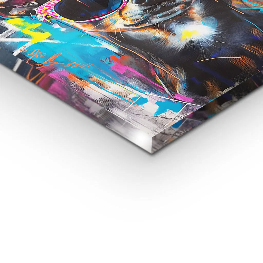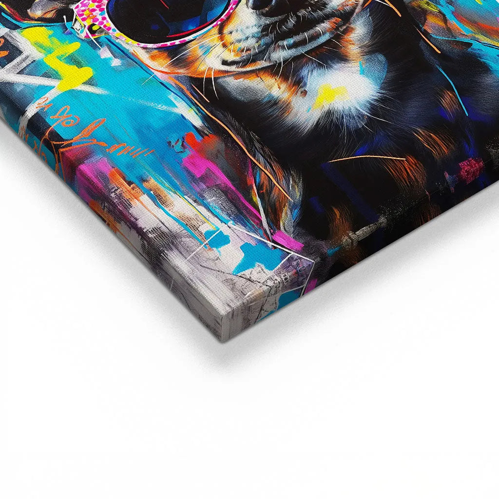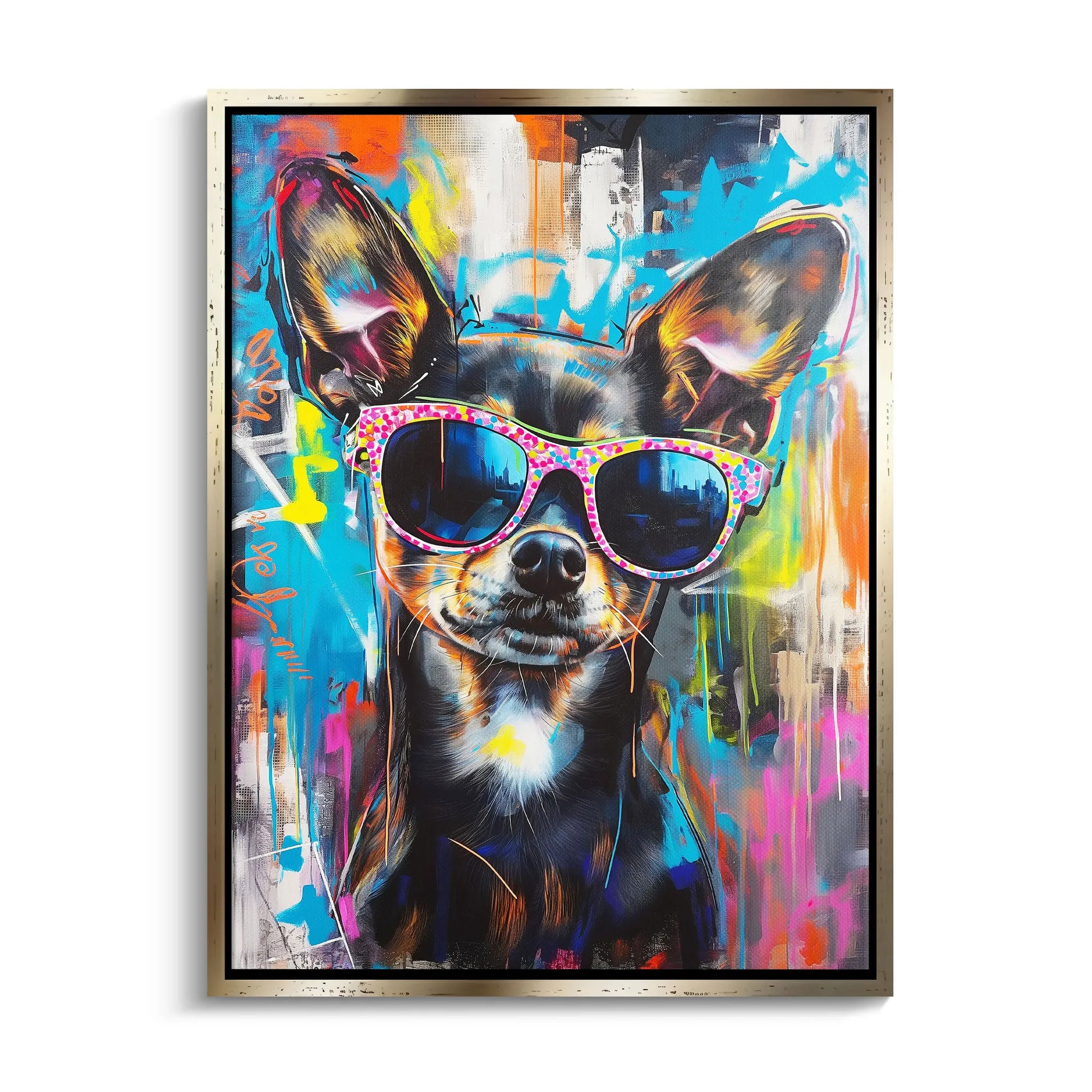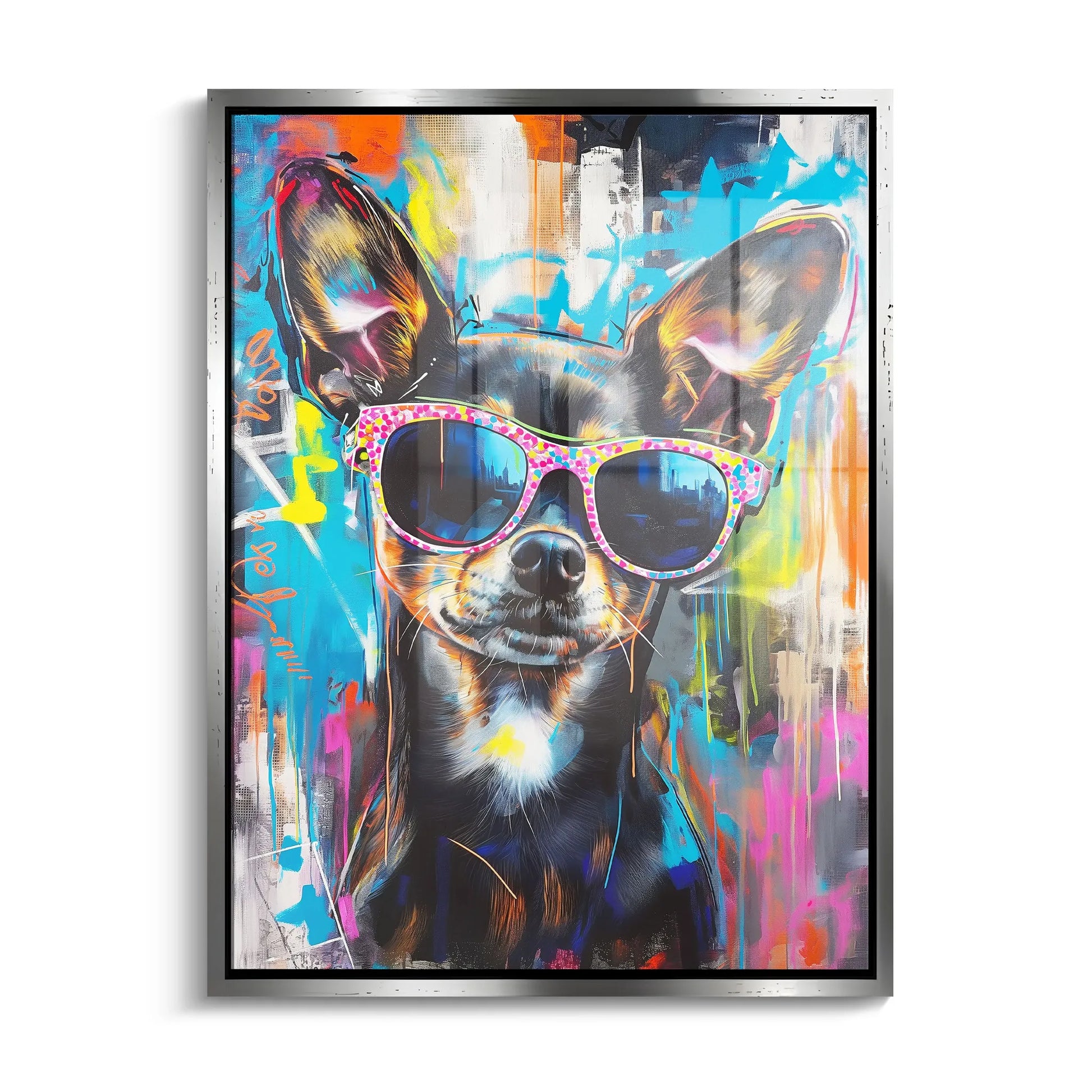 Das Wandbild "Bad Girl" von Canvarisma vereint frechen Hundecharme mit urbaner Kunstexplosion. Dieses ausdrucksstarke Kunstwerk zeigt einen selbstbewussten Chihuahua mit riesigen Stehohren und gepunkteter Sonnenbrille, der direkt in die Kamera schaut. Die Skyline-Reflexion in den Sonnengläsern verleiht dem kleinen Hund großstädtischen Coolness-Faktor. Der explosive Hintergrund aus leuchtenden Farbspritzern in Türkis, Pink, Orange, Gelb und Neongrün sowie expressiven Pinselstrichen schafft eine dynamische Street Art-Ästhetik voller Energie und Lebensfreude.