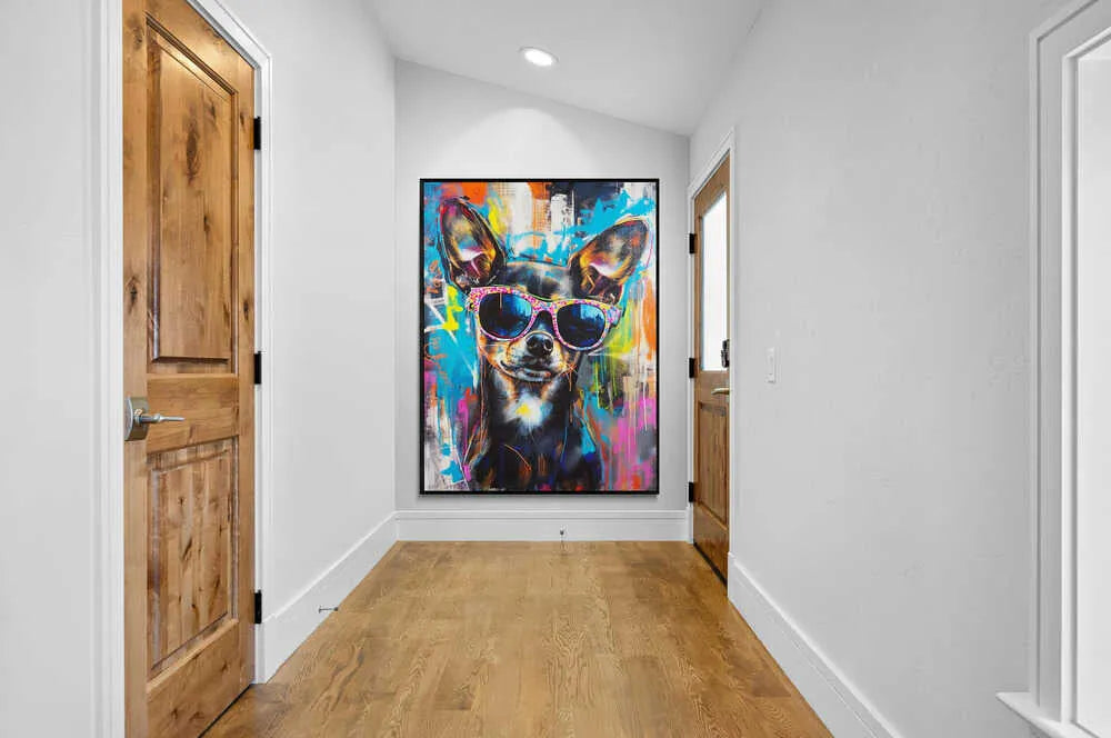 Das Wandbild "Bad Girl" entfaltet seine volle Wirkung in Wohnzimmern, Jugendzimmern, Homeoffices oder Loft-Wohnungen. Der selbstbewusste Chihuahua erinnert daran, dass auch die Kleinsten großen Charakter haben können - eine zeitlose Botschaft über Selbstbewusstsein, Individualität und die Freiheit, frech und cool zu sein, unabhängig von der Größe.