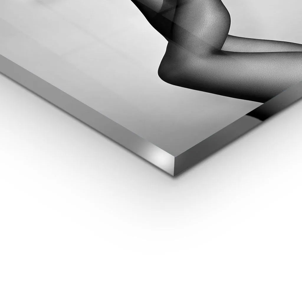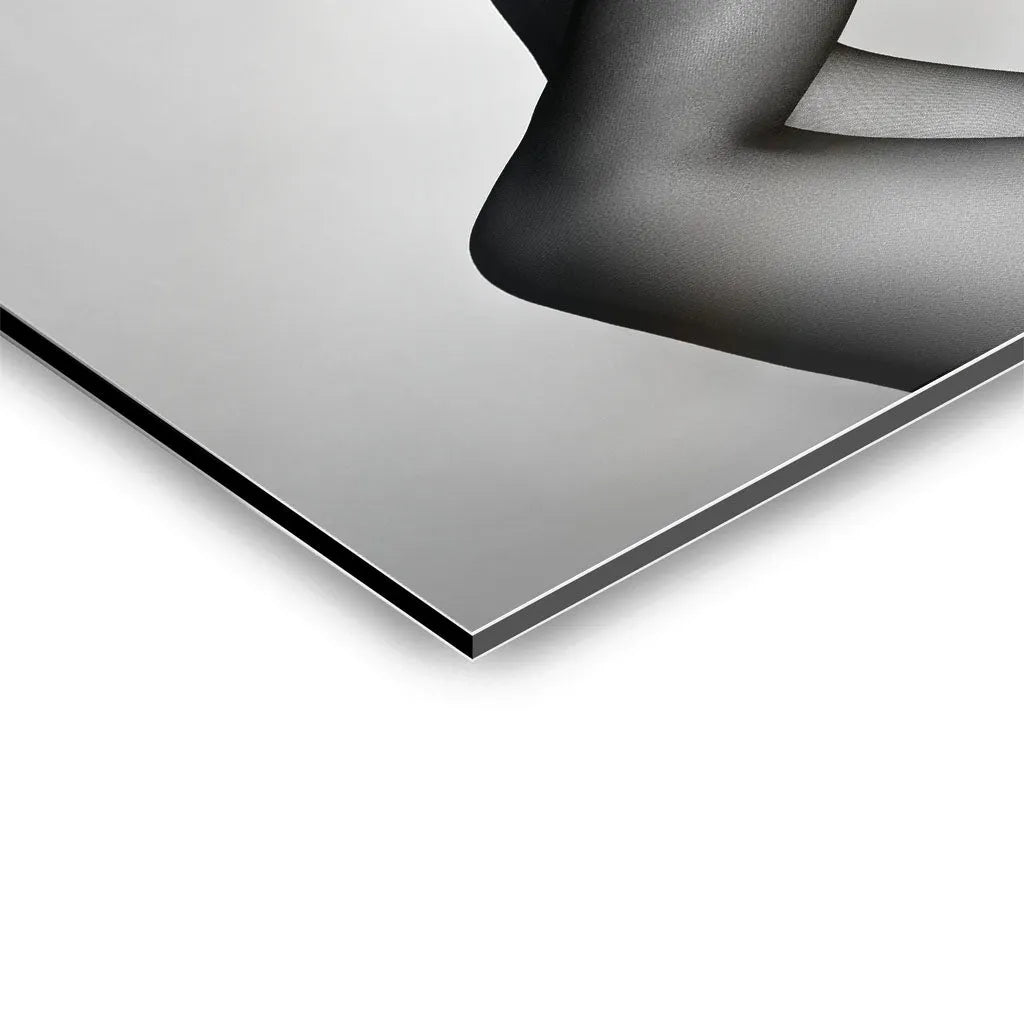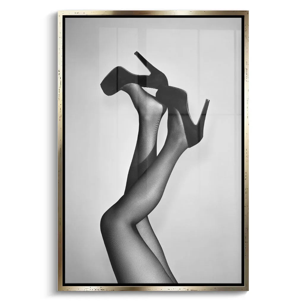 Das zeitlose Design orientiert sich an ikonischer Fashion-Fotografie und schafft durch die Reduktion auf Schwarz-Weiß eine klassische, sophisticated Ästhetik. Die hohen Plateau-Pumps mit charakteristischer Silhouette werden zum Hauptdarsteller dieser visuellen Erzählung. Die subtile Netzstrumpfhose-Textur verleiht den Beinen zusätzliche Dimension, während der cleane Hintergrund moderne Galerie-Qualität garantiert. Die Komposition folgt den Prinzipien der Fine-Art-Fotografie und macht das Kunstwerk zu einem zeitlosen Statement über feminine Mode und Selbstbewusstsein.