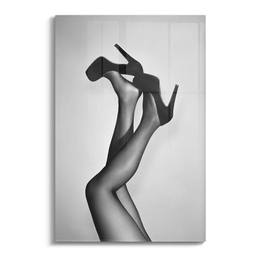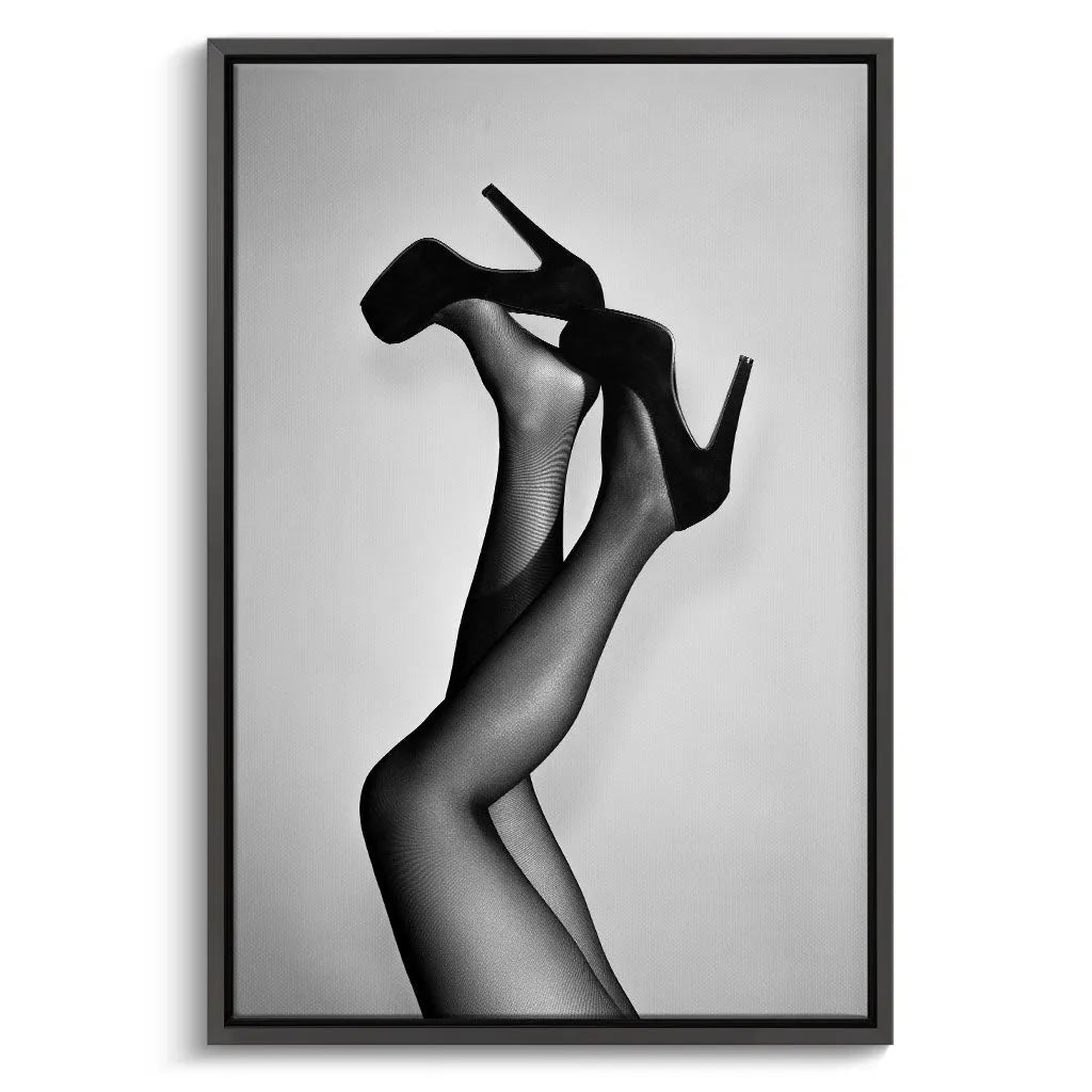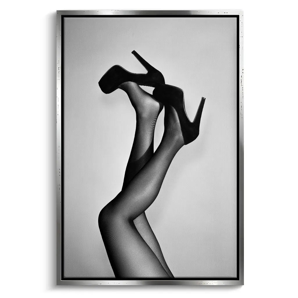 Das Wandbild "Velvet Pumps" von Canvarisma vereint zeitlose Eleganz mit künstlerischer Reduktion. Dieses ausdrucksstarke Kunstwerk zeigt weibliche Beine in verführerischer Haltung, die klassische schwarze Pumps mit Plateausohle tragen. Die schwarz-weiße Fotografie betont die eleganten Konturen der Beine durch feine Netzstrumpfhose-Textur, während der minimalistische hellgraue Hintergrund die Aufmerksamkeit vollständig auf die Silhouette lenkt. Die dynamische Pose mit einem Bein entspannt und dem anderen kraftvoll angewinkelt schafft eine Balance zwischen Eleganz und selbstbewusstem Ausdruck.