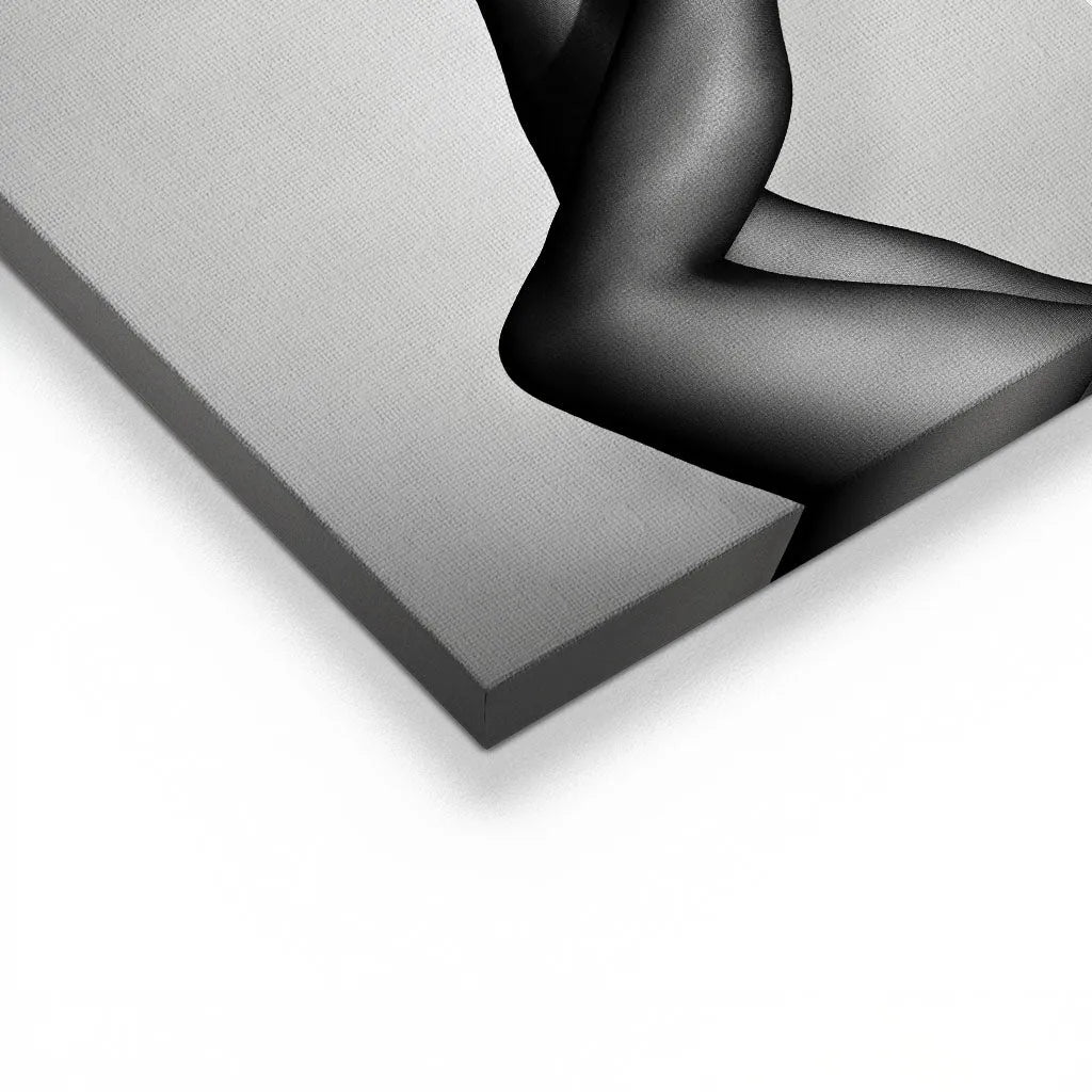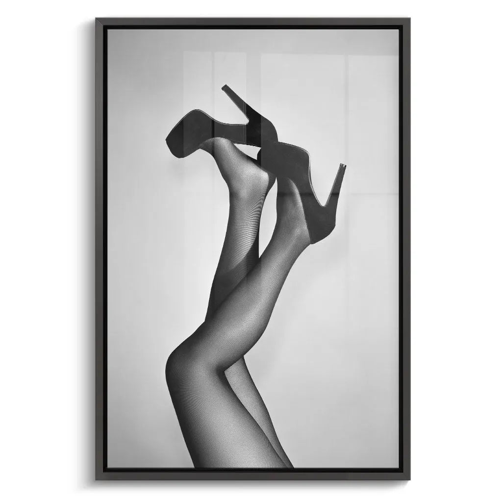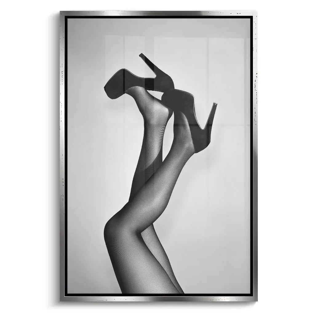 Das Wandbild "Velvet Pumps" von Canvarisma vereint zeitlose Eleganz mit künstlerischer Reduktion. Dieses ausdrucksstarke Kunstwerk zeigt weibliche Beine in verführerischer Haltung, die klassische schwarze Pumps mit Plateausohle tragen. Die schwarz-weiße Fotografie betont die eleganten Konturen der Beine durch feine Netzstrumpfhose-Textur, während der minimalistische hellgraue Hintergrund die Aufmerksamkeit vollständig auf die Silhouette lenkt. Die dynamische Pose mit einem Bein entspannt und dem anderen kraftvoll angewinkelt schafft eine Balance zwischen Eleganz und selbstbewusstem Ausdruck.