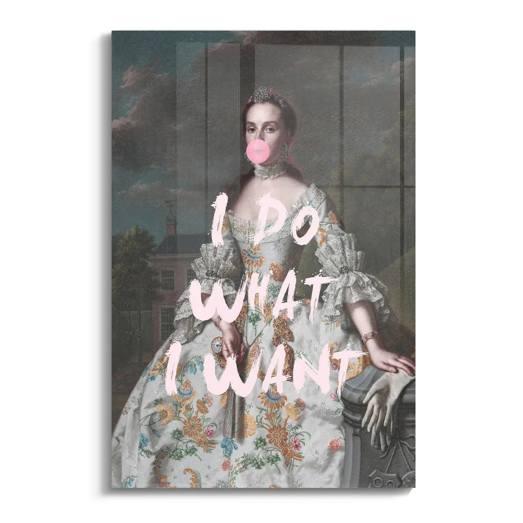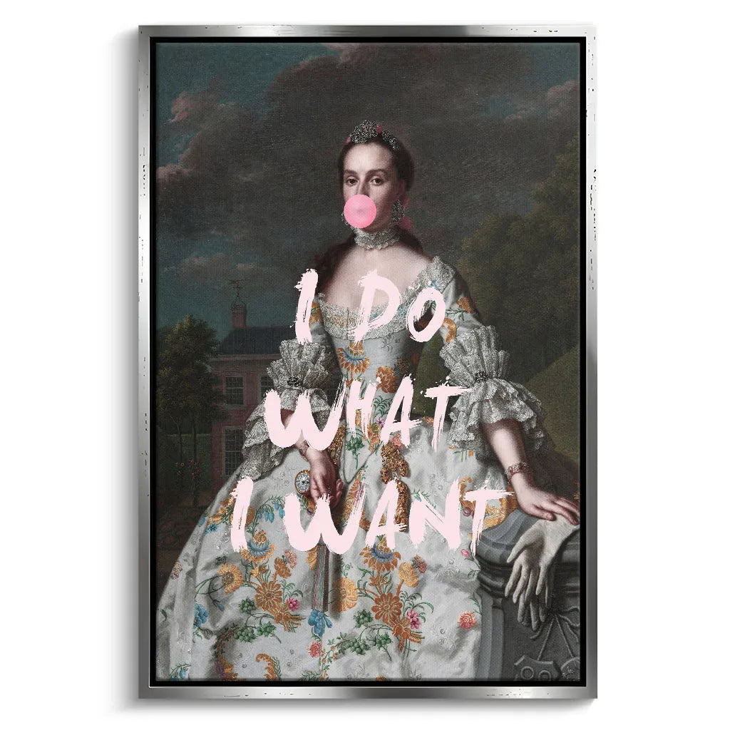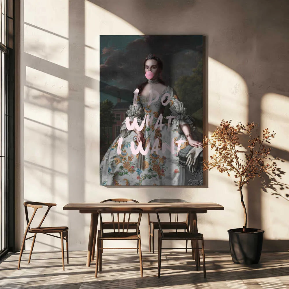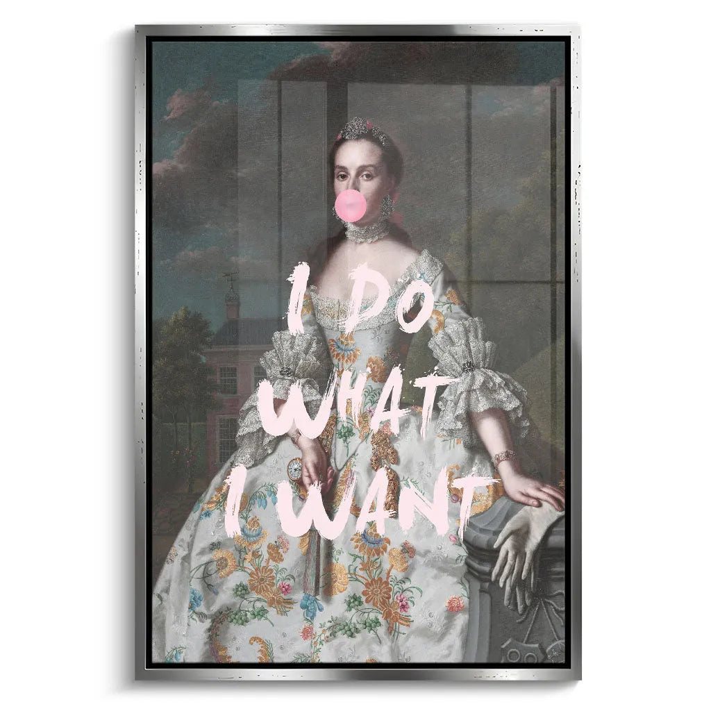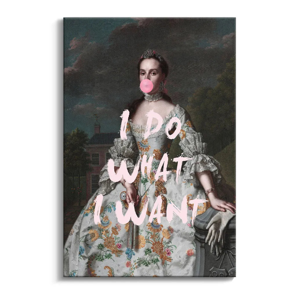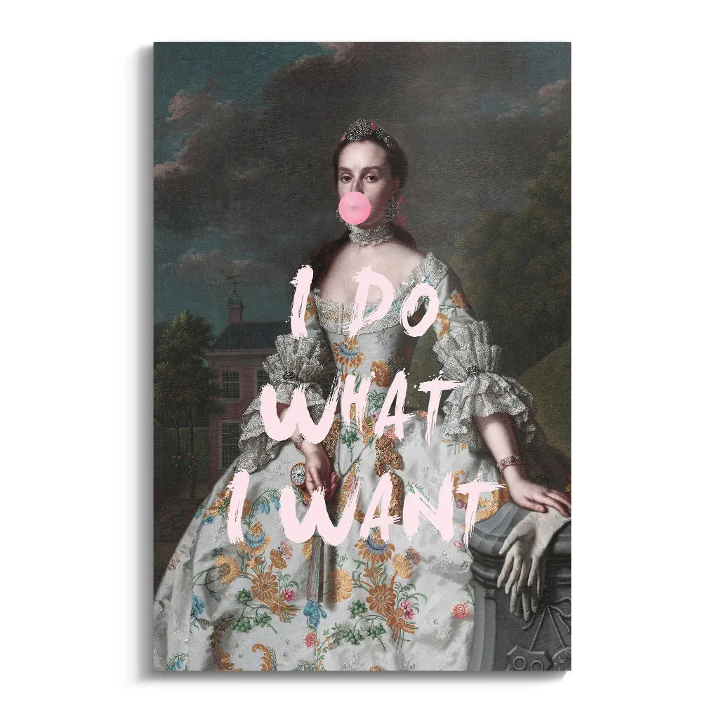 Das kontrastreiche Mixed-Era-Design orientiert sich an klassischen Rokoko-Portraits und schafft durch die moderne Bubble Gum-Intervention eine humorvolle Zeitkollision. Die detailreiche historische Malweise mit dramatischem Wolkenhimmel, aristokratischem Anwesen im Hintergrund und prächtiger Robe wird durch die pinke Kaugummiblase und die handgeschriebene Rebellion "I DO WHAT I WANT" zu einem feministischen Statement. Der Kontrast zwischen höfischer Etikette und moderner Selbstbestimmung verleiht dem Kunstwerk seinen einzigartigen, provokanten Charakter.