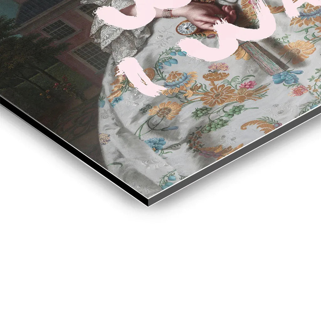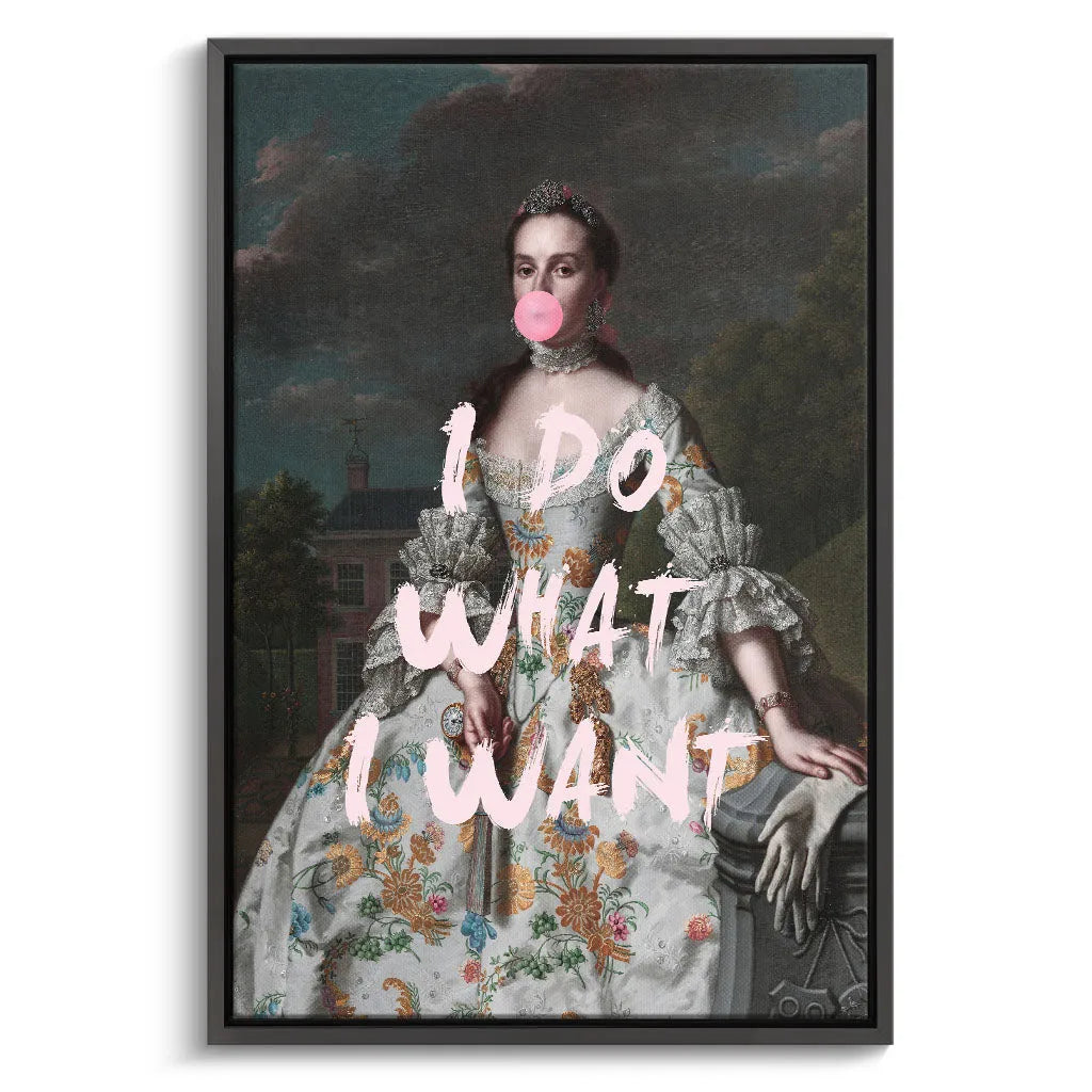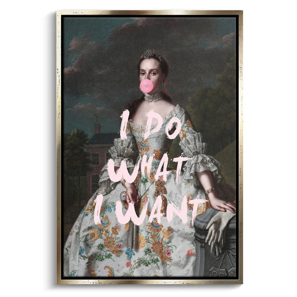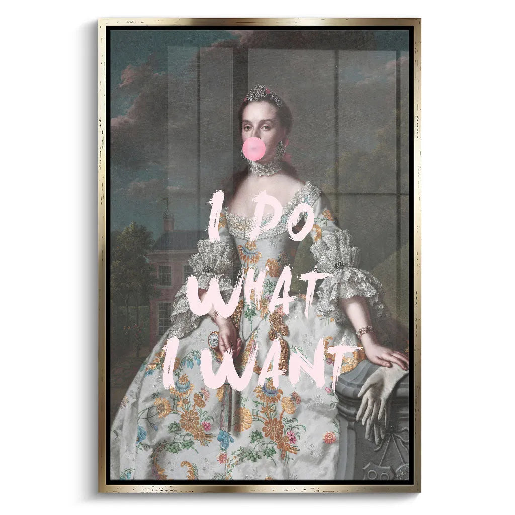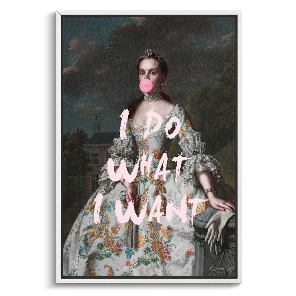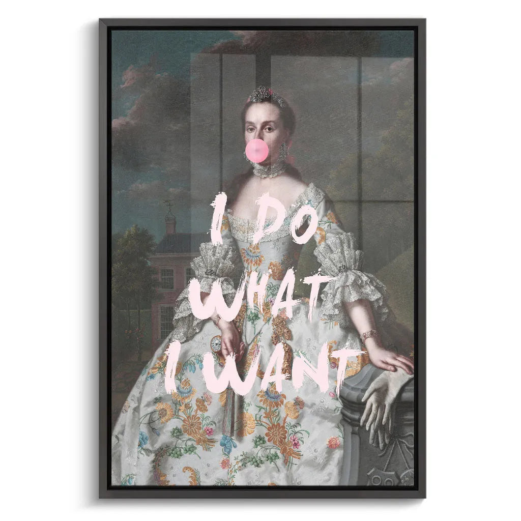 Das kontrastreiche Mixed-Era-Design orientiert sich an klassischen Rokoko-Portraits und schafft durch die moderne Bubble Gum-Intervention eine humorvolle Zeitkollision. Die detailreiche historische Malweise mit dramatischem Wolkenhimmel, aristokratischem Anwesen im Hintergrund und prächtiger Robe wird durch die pinke Kaugummiblase und die handgeschriebene Rebellion "I DO WHAT I WANT" zu einem feministischen Statement. Der Kontrast zwischen höfischer Etikette und moderner Selbstbestimmung verleiht dem Kunstwerk seinen einzigartigen, provokanten Charakter.